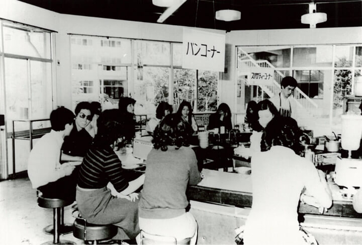 喫茶「パオ」は、昭和42(1967)年開業の軽食を提供する喫茶店でした。同窓生や教職員の方にとって最も思い出に残る建物ではないでしょうか。軽食と称しながらも、スパゲティを中心としたボリュームのあるメニューの数々は、「青春の味」として記憶されている方も多いと思います。また、隣接する飲食スペースはいつの頃からか「出店」と呼ばれるようになり、主に団体・サークル仲間の集いの場として、ランチタイムや授業の合間などは大変な賑わいでした。