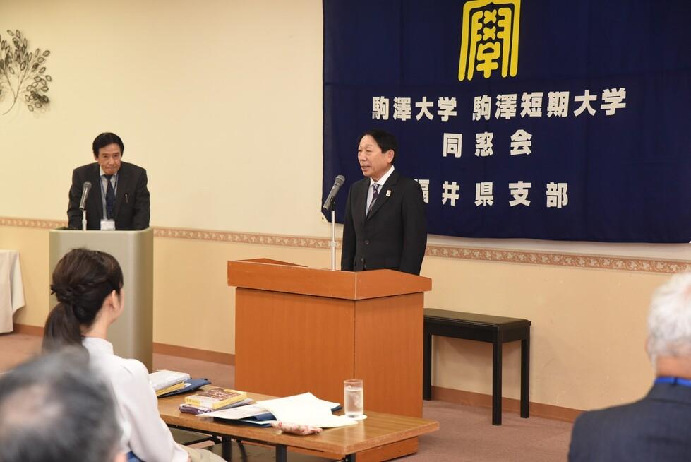 総会は、道端会長の挨拶の後、来賓としてご臨席いただきました駒澤大学同窓会副会長の山本泰之様よりご挨拶と合わせて駒澤大学の近況についてお話を伺い、ご祝辞を賜りました。