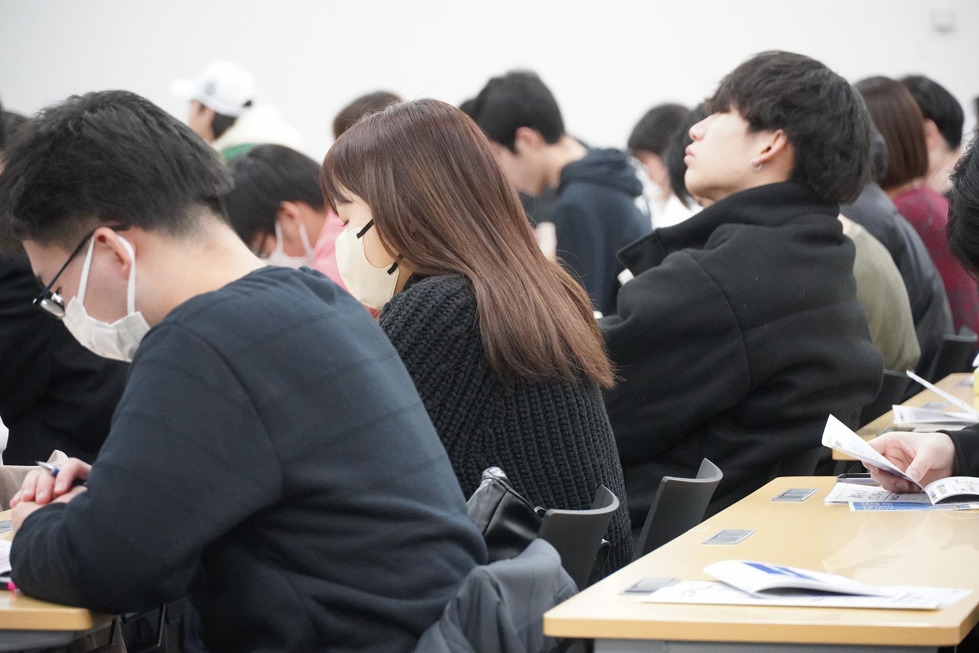 就職活動の全体像から3年次になった際の具体的な準備についてまでお話しいただき、公務員試験との併願に関する注意点についても触れて解説いただきました。残り1カ月少しの春休み期間にできる準備のポイントなどを学生に伝えて頂き、参加学生たちは不安が軽くなったような表情でした。