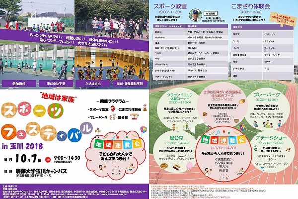 今年度も「スポーツフェスティバル in 玉川」を開催いたします。「地域は家族」を大きなテーマとし、「教育活動の機会提供」と「地域における共生社会の実現」を目的としてスポーツ教室やこまざわ体験会、地域運動会などを開催します。詳細な情報は本ページで発信して参ります。