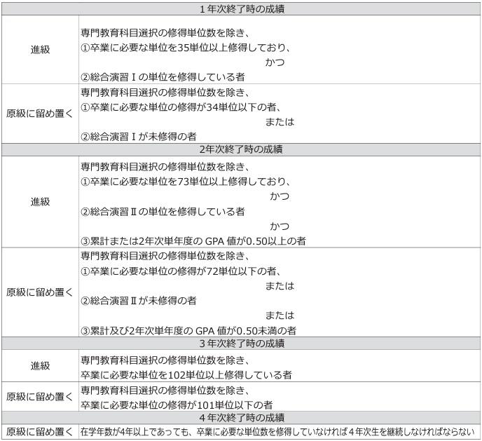 学業奨励を目的として、進級に際し、進級基準単位数を「駒澤大学進級規程」で定めております。進級基準単位数は学部・入学年度により異なります。