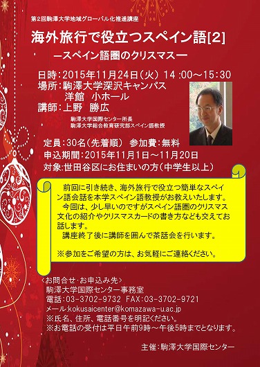 第2回駒澤大学地域グローバル化推進講座として、「海外旅行で役立つスペイン語-スペイン語圏のクリスマス-」を開催いたします。
