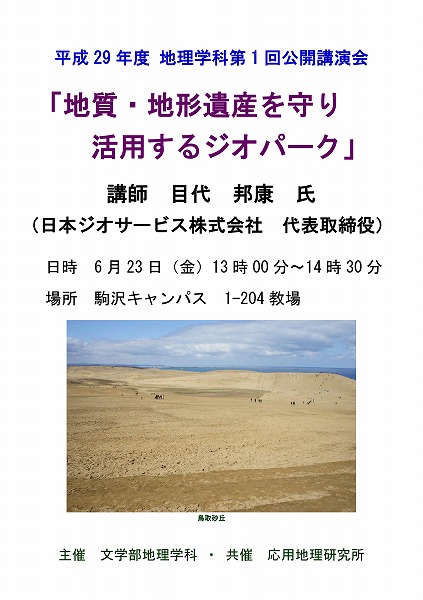 | 演 題 | 「地質・地形遺産を守り活用するジオパーク」 |