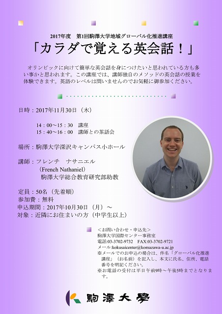 2017年度 第1回駒澤大学地域グローバル化推進講座「カラダで覚える英会話!」を開催します