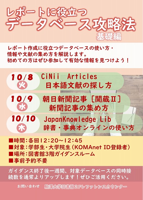図書館では学部生・大学院生を対象に、レポート作成に役立つデータベースを3日間にわたってご紹介します。データベースを利用したことのない方はぜひご参加ください。