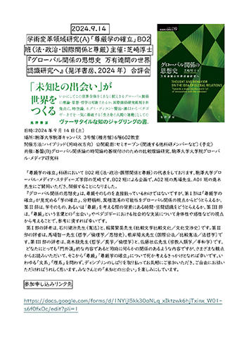 芝崎厚士『グローバル関係の思想史 万有連関の世界認識研究へ』(晃洋書房、2024年)合評会のお知らせ 以下の通り、学術変革領域研究(A)「尊厳学の確立 尊厳概念に基づく社会統合の学際的パラダイムの構築に向けて」B02班(法・政治・国際関係と尊厳)が主催する合評会を開催いたします。 書評対象は、本学グローバル・メディア・スタディーズ学部教授で、本学大学院グローバル・メディア研究科委員長の芝崎厚士先生の、『グローバル関係の思想史 万有連関の世界認識研究へ』(晃洋書房、2024年)です。