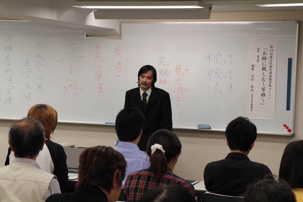 今回で11回目となる好評の写経セミナー。今回は、書道家 綾部宏行 先生(本学非常勤講師)を講師にお迎えしました。今回の写経は、まず「般若心経」についてご講話いただき、続いて写経の実践をしました。その後、綾部先生による好評をいただきました。