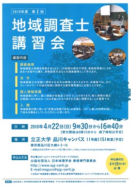 日本地理学会では,「地域調査士」資格取得のための講習会を開催しています。今年度第一回の講習会は4月22日(日)に立正大学品川キャンパスで開催されます。 資格取得を希望する者は,講習を必ず受けなければなりません。申し込み締切は4月18日(水)です。詳しくは日本地理学会資格専門委員会サイトをご覧ください。