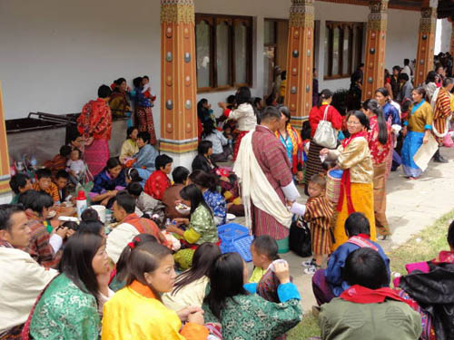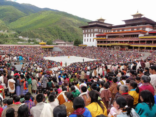 ティンプーでは、2007年までツェチュはゾンの中で行われていましたが、場所が狭いということで、今は、ゾンの北に隣接する広場で行われています(写真1)。ツェチュは、朝9時ごろから始まり夕方4時か5時ぐらいまで続き、ブータンの国営放送(BBS)のテレビですべて生中継されました。
