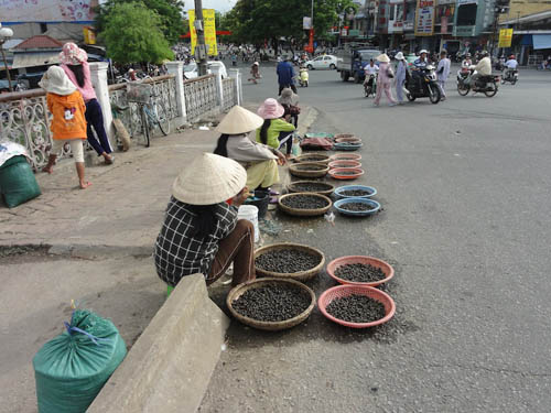 ヘン島には、島の真ん中と西岸に、南北にのびる2本の細長い道があります。西岸の道の河岸には、広葉樹やバナナなどに混じって密集した竹林も見られ、幅数mの土手のようになっています(写真4)。洪水時には、川の流れをやわらげ、土砂の流入や堆積を防ぐ役目を担っているのでしょう。 一方、島の真ん中の道沿いには、住宅のほか、教会や幼稚園、カフェやビリヤード店、床屋やバイク修理屋など小さな店がいろいろあります(写真5)。ある食堂の入り口には、大伸ばしの新郎新婦の写真が掲げられ、披露宴の準備中でした。この道を南端(上流側)まで行ってみると、道はそのままフオン川に没し、そこもこの島と旧市街地とを結ぶ舟付き場になっていました。 今回は自転車で、島の2本の道を走ってみましたが、「シジミ島」と称するにしては、それらしい様子を見ることができませんでした。そこで、次は旧市街地から直接小舟でヘン島に渡り、じっくり歩いてみることにしました。 | |||||||||