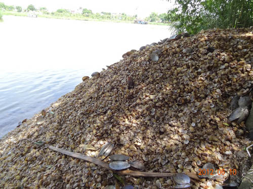 ドンバ市場裏手から小舟に乗って、ヘン島最南端に向かいます。しかし船頭は、先日確認した舟付き場でなく、島の東岸に回り込んでほどなく着岸。そこに道はなく、迷いながら人家の裏庭を通って路地を抜けると、ちょうどシジミをゆでる大釜と薪を積んだ小屋に遭遇、そばにはシジミ殻が山積みになった「貝塚」もありました(写真9)。長さ2cmほどの大量のシジミ殻に混じって、長さ10cm弱のムール貝に似た殻もあります。やはりこの島は、シジミの島だったのです。しかしこの貝塚のほか、「シジミ料理」の看板を出した数軒の食堂が目につきましたが、その他にシジミに関連するものは見当たりません。むしろ、数人の女性がミシンを前に働いている複数の縫製所が、印象に残りました。 |