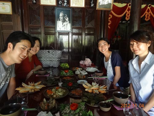 自分の時間を過ごすルーラルツーリズム フックティック村では、1989年に村の主産業であった窯業が廃止され、人口も急減してしまいましたが、2009年から、新たなツーリズムへの取り組みが始まりました。村に残された伝統的家屋を再生・活用し、陶器づくりの復活やボートツアー、地元料理の提供なども含めた「ルーラルツーリズム」です。 現在フエでは、世界遺産に登録されている旧王宮の建物群と歴代皇帝の墳墓が観光の中心で、フックティック村を訪れるツアー客はまだまだ少数です。テーさん宅の宿泊者は、1年間に100人ほどだそうです。しかし、先に「フエ便り(3)」で紹介したフエ市郊外の「タントゥイ村のタントアン橋」や、海岸地帯の「ラグーンをめぐるエコツアー」と同様、ぜひ少人数でフックティック村を訪ね、水と緑に囲まれた村を散策しながら、自分なりのゆったりとした時間を体験してみて欲しいと思います。 |