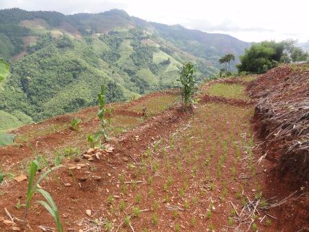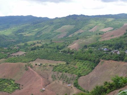 ラオス南部から帰った翌々日には、北部タイでの調査に向かいました。そこでの共同研究者であるシルパコン大学のプラパン先生は、森林保全と山村の農業の両立をはかるため、地理情報システムの技術を応用して、ムラの人たちが自分たちで土地利用のルールを決める活動に関わってきました。北タイゼミのカウンターパートであるNGOのリンクと同じような活動をしてきたわけです。この地域の山村に住む少数民族の人たちの経済活動や生活は、交通などのインフラストラクチャーの整備とともに、近年、急速に変化しています。そのような変化は土地利用にもはっきりとあらわれていて、たとえばGoogle Earthで経緯度19.135, 100.995にジャンプして、2001年と2010年の土地利用を比べてみてください。このルア族のパンヤン村では、従来の焼畑での陸稲栽培に代わり、トウモロコシの連作や輪作が年々拡大しています。森林休閑の行われてきた山斜面では、今では階段耕作が行われるようになりました。 |