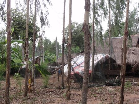 メコン便りは今回が最後ということで、あっという間の2か月間でした。その間にも雨季は次第に深まって、イサーンの水田でも田植えがずいぶん進んできました。日本の田植えと違って、短期間のうちに一斉に終わるのではなく、適宜というべきか、だらだらというべきか、焦ることなく物事が進められていくこのゆるさが、タイらしいところです。 前回予告の通り、7月1日から3日まで、ダンサイでピータコンの祭りを見てきました。ダンサイへの往路は、メコン水系とチャオプラヤ水系を隔てるペッチャブーン山脈を越える道をとりました。山越えの場所は、1月にも3年ゼミの発表会で訪れたナムナオ国立公園です。その山麓のユーカリの森の中に写真のようなムラがあります。イサーン土地改革委員会の活動家であるプラモートさんの案内で村を訪ねてみました。このボーケオ村には、現在、170世帯ほどが住んでいますが、水道も電気もありません。2年前に、ここから約1.5q離れたトゥンプラ村から移ってきて家を建てたばかりだそうです。ユーカリのプランテーションの所有者であるタイ林業機構から見れば、違法な占拠者の侵入ということになりますが、この状況の背景には複雑な事情があって、村の人たちと林業機構の間で土地の権利をめぐる係争が続いています。村の人たちによれば、60年以上も前からこの土地を利用していたそうですが、1973年に林業機構がユーカリの植林を開始して対立が始まりました。村の人たちは238ヘクタールの土地の権利を主張して、その裏付けとなる証拠を集めてきましたが、近年、土地の権利の認定にあたって利用現況が重視されるようになったため、社会へのインパクトも考えて、移住を断行したそうです。タイの森林・土地政策の変遷はこの村の歴史でもあります。林業機構の所有物であるユーカリの間に植えられたバナナが、村の人たちの立場を象徴しているかのようでした。 |