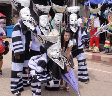 さて、ピータコン祭です。現在のピータコン祭は、写真のように、カラフルな仮面でピー(おばけ)に仮装したたくさんのグループが、ロック音楽にあわせて踊ったり、観光客と記念撮影をしたりと、にぎやかなイベントとして知られています。普段は静かなダンサイの町も、この祭りの時ばかりは観光客で大混雑します。市長さんにインタビューして、祭りの運営管理の問題などを聞きましたが、今年は総選挙の投票日を控えて土曜日の18時から酒類の販売が禁止になり、酒に酔っての喧嘩などが少なくて、少しは楽だったようです。その混雑の中で、北タイゼミの現地活動でいつもお世話になっている運転手のビィーさんと偶然会ったのには驚きました。 |