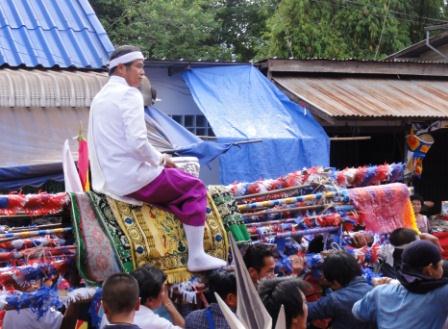 祭りは3日間ですが、全体を通して見ると、そこにタイ=ラオの人たちの文化の重層性や、ダンサイの歴史を伺うことができます。たとえば、ピーは森の中から現われるという想定で、アニミスティックな存在でありながら、その姿には基本的な型があり、頭の上の竹籠、手に持った刀の形、腰に着けたカウベルなどに農耕と関連した要素が見られます。一方、祭りのハイライトは2日目に市内を回る行列で、仏像を先頭にして、僧侶の乗った輿がそれに続きます。行列には性別の誇張された一組の男女の巨大なピーもつき従います。最後にチャオポーグアンと呼ばれる長老の男性が雨乞いのロケットにまたがって登場すると、地元の人たちからはひときわ大きな歓声で迎えられます。この町では代々、一組の男女が長老の地位を受け継いで、地域社会で指導者的な役割をはたしてきました。彼らには先祖との間を媒介する霊的な力があると信じられています。このように、男女を区別した祖先崇拝と森林の自然崇拝的な要素が結びついて、子孫繁栄と豊穣を願う農耕祭を構成する行事は、ルアンパバーンやチャンパーサックなどのラオス側にも見られます。祭りは3日目に終日の読経でしめくくられますが、仏教との関係を解釈するためには、ダンサイの歴史と長老の役割についての理解が必要になります。より詳しい説明は別の機会に譲るとして、ここでは、ダンサイにタイとラオスの友好の証として16世紀に建立された仏塔があること、ダンサイの近くに製塩用の井戸があって地域の重要な資源となってきたことなどが幸いし、この地域は両国からの強い政治的介入を避けて文化的独自性を保つことができたのだろうと指摘するにとどめます。 |