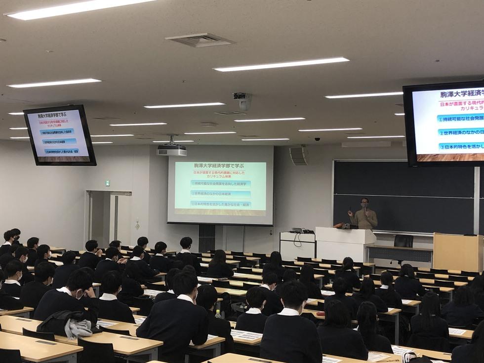 駒澤高校の生徒向けに「大学指導講座」が行われました 経済学部に進学する予定の駒澤高校の生徒向けに「大学指導講座」が行われました。経済学部のカリキュラムの説明や勉強面での高校と大学との違いなどが示されるとともに、大学での講義がどのような性質のものなのかを体験する、「より良い社会のために?経済学にできること?」と題するデモ講義が行われました。 前の記事 次の記事