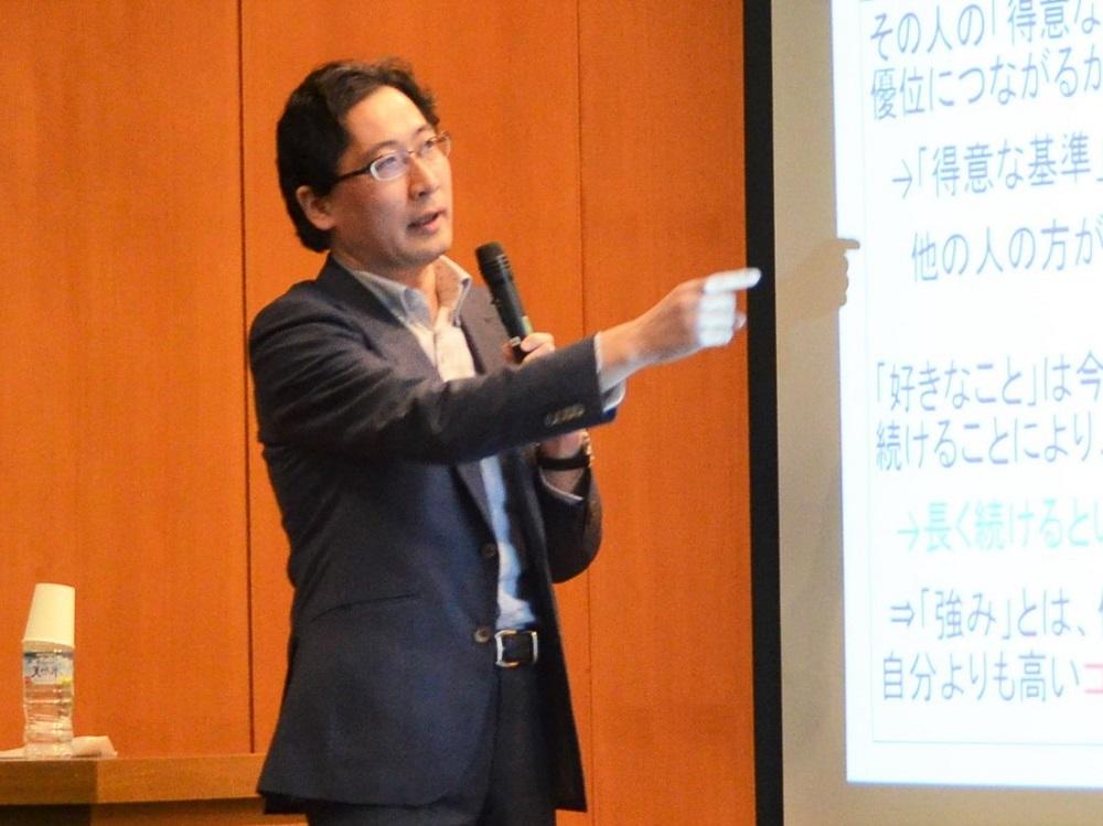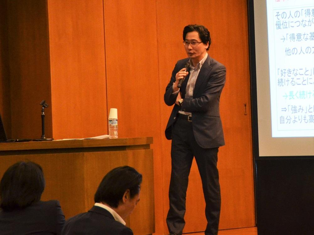 ベストティーチング賞受賞者による実践事例紹介をテーマにした今回のFD研修会では、文学部小野洋平先生、総合教育研究部畠山寛先生とともに、経営学部から中村公一教授が登壇されました。受賞科目となった「経営戦略論」では、単なる用語解説にとどまらず、授業の知識から駒大生の優位性につながる実生活への教訓が説明されました。