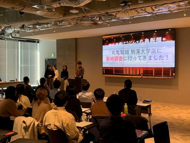 経営学部・中村公一ゼミ3年生(19期生)が、2月21日(金)に、本学の学食に店舗もある「丸亀製麺」で有名な株式会社トリドールホールディングスの東京本社(渋谷ソラスタ)にて協働プロジェクトの報告会を行いました。報告会では、粟田貴也社長(代表取締役社長兼CEO)をはじめ、約30名の経営陣や社員の方々を前にプレゼンを行いました。