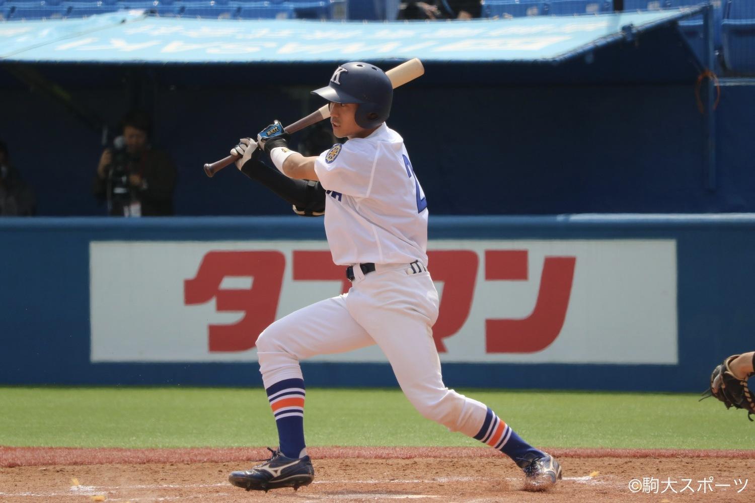 追加点といきたい駒大は、3回は三者凡退に倒れるものの、4回先頭の渡邉が死球で出塁すると、今季代打で結果を残し、初スタメンを勝ち取った⑦角田の右越え2塁打で追加点、その後相手の牽制エラーの間に走者を進め、一死三塁で⑨髙田の中安でこの回2点をあげ、4点リードで試合をすすめる。