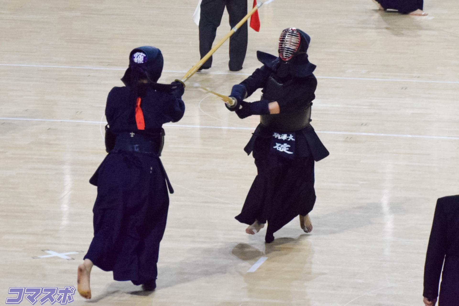 個人戦初出場で駒大唯一シードの佐藤佳音(歴4)は、2回戦の岩瀬(学習院大)が胴を打って振り返ったところの隙をついた面二本で二本勝ち。3回戦は市川(尚美学園大)から延長で飛び込み面を奪って一本勝ち。4回戦柴原(国際武道大)から面を二本奪って勝利した。5回戦では森園(法大)に竹刀を払い落とされて反則をしてしまう。試合は延長にもつれ込んで両者譲らず攻め続けるが、佐藤が再び竹刀を払い落とされ、反則二回で相手に一本が与えられて負けとなってしまった。