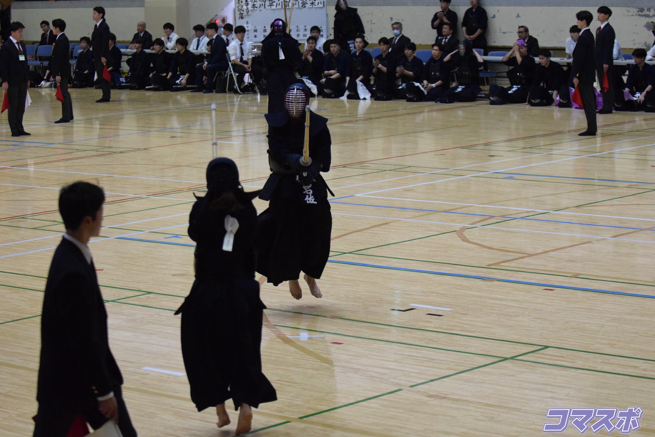 初戦は国学大との対戦。先鋒の大上慶(G2)は引き分けるが、この試合次鋒で大学初試合の波多野準也(法1)が岡本(国学大)に小手を取られて一本負けし、国学大にリードされてしまう。波多野と同じく大学初試合で七将の原知優(仏1)は一本を先取するも若杉(国学大)に面を取られて両者一本ずつで引き分け。六将の大平竜也(政2)と中堅の髙村慎之助(商2)も一本ずつでの引き分けとなり、なかなか追いつくことができない。四将の平吹侑也(社2)は面と胴で二本勝ちすると、志礼海龍(経1)は小手と面で二本勝ち。山口拓(英2)は面で一本勝ちと駒大が連続勝利で逆転勝利を果たした。