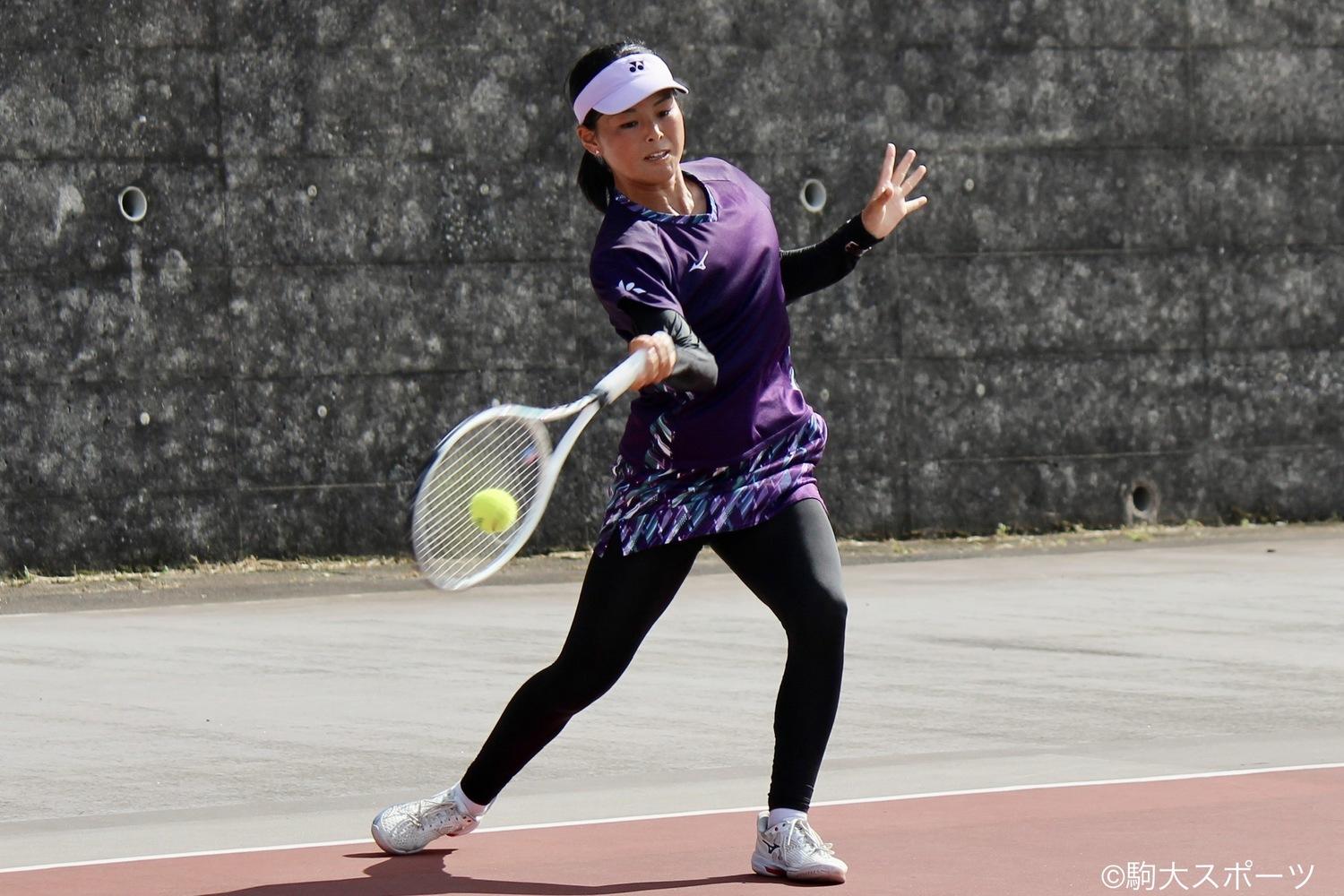 ダブルスを連勝。シングルスでもS1の谷本ひなた(市4)、S3の猪瀬瑞希(英4)、S4の丸希星(法4)が勝利し5-2で快勝した。