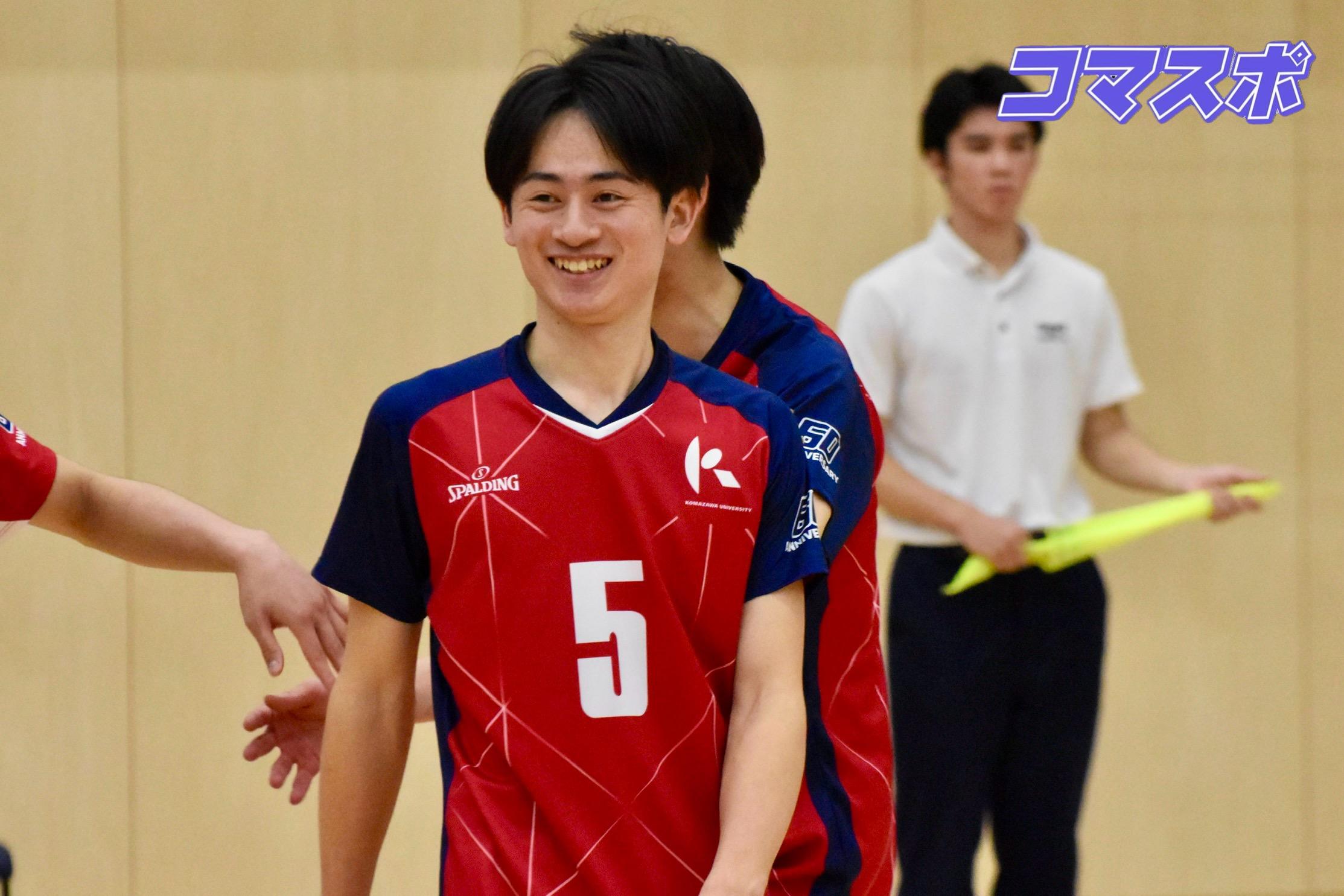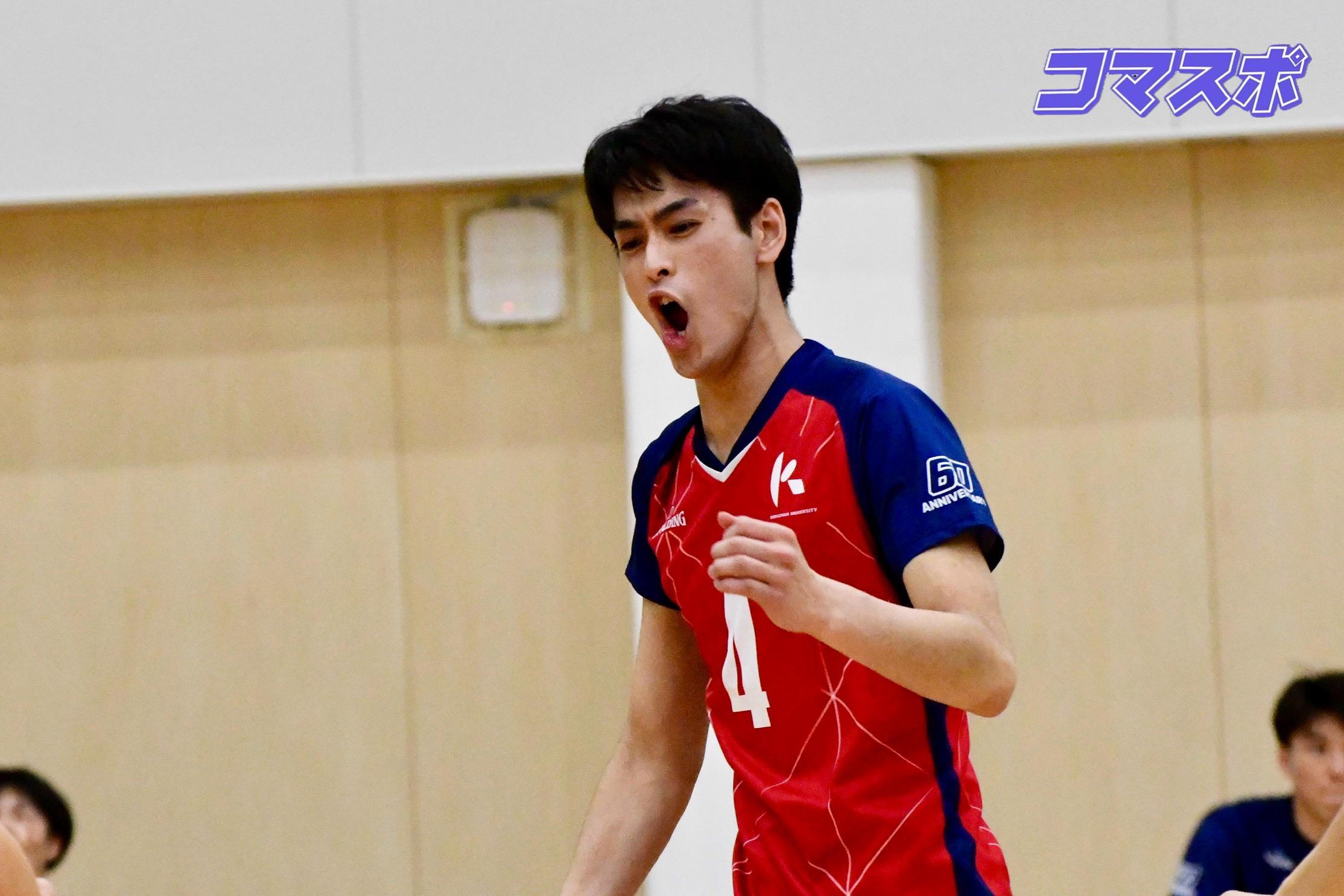 第1セットは序盤から互いに点を取り合う展開となる。同点のまま試合は中盤にもつれこみ、尾﨑太洋(経2)のツーアタックにより13-12の場面、菅原秀斗(歴1)と尾﨑がそれぞれブロックを決め2連続得点。一気に点差を広げる。その後もブロックポイントと積極的な攻撃でリードを守り、先に20点台へ突入。小林拓磨(営2)のブロックで点を取り迎えた駒大のマッチポイント。菅原の2枚ブロックを無視したクロスのスパイクが決まり25-23で1セット目を先取した。