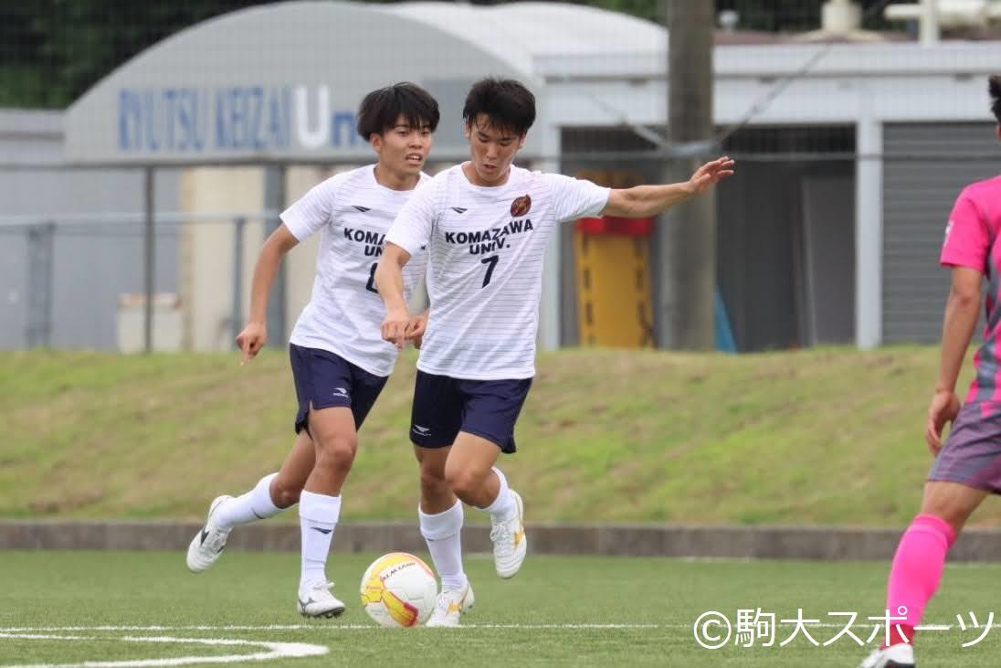 後半も攻撃の手を緩めない駒大は49分にフリーキックの流れから小林がボレー、54分には後藤のクロスから松本がシュートを放つも流経大の体を張ったブロックによりゴールとはならず。しかし72分。途中出場の塚原がペナルティエリア内で倒されて得たPKを小島がゴールネット左隅に蹴り込んで追加点。試合終盤に流経大の猛攻に遭い、コーナーキックから失点を喫するも2-1でタイムアップ。前期最終節を2連勝で飾った。