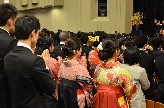 式は23日と24日の午前と午後、計4回に分けて行われ、大学院修了生66人、学部卒業生3,424人の合計3,490人が本学を巣立ちました。晴着に身を包んだ卒業生らは恩師や友人と語らい、別れを惜しんでいました。