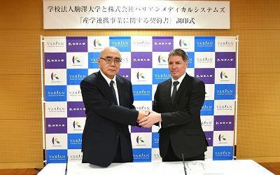学校法人駒澤大学と株式会社バリアンメディカルシステムズ(日本法人)が、日本で初めて、産学連携による「放射線治療人材教育センター」を設立します。同センターは、本学駒沢キャンパスで建設中の開校130周年記念棟「種月館」に設置する予定です。これに伴い、11月28日(月)に深沢キャンパスにて契約書の調印式を執り行いました。