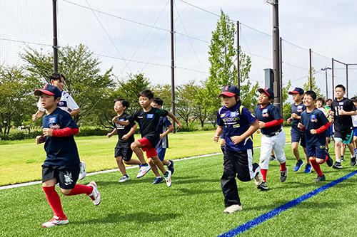 今回は、岩手県一関市狐禅寺の一関サッカーラグビー場で開催にて県内の小学生52人、ヒロセ電機株式会社の社員の皆さまにご参加いただきました。陸上競技部に所属する学生とコーチによる指導のもと、ご参加の皆さまへストレッチのポイントやランニング体験を行いました。