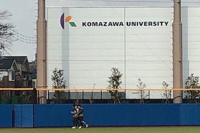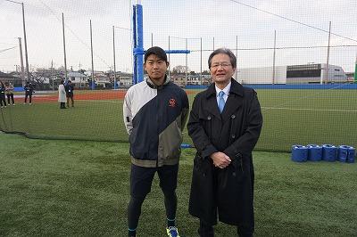 トレーニング終了後、本学硬式野球部部長の 代田 純 教授(経済学部)と歓談した今永選手は、「思い出のこの祖師谷が昨年の夏に新しいグラウンドになり、私自身も2020のシーズンに向けて新たな気持ちで始動できました。今シーズンの活躍に期待してください。」とコメントしました。