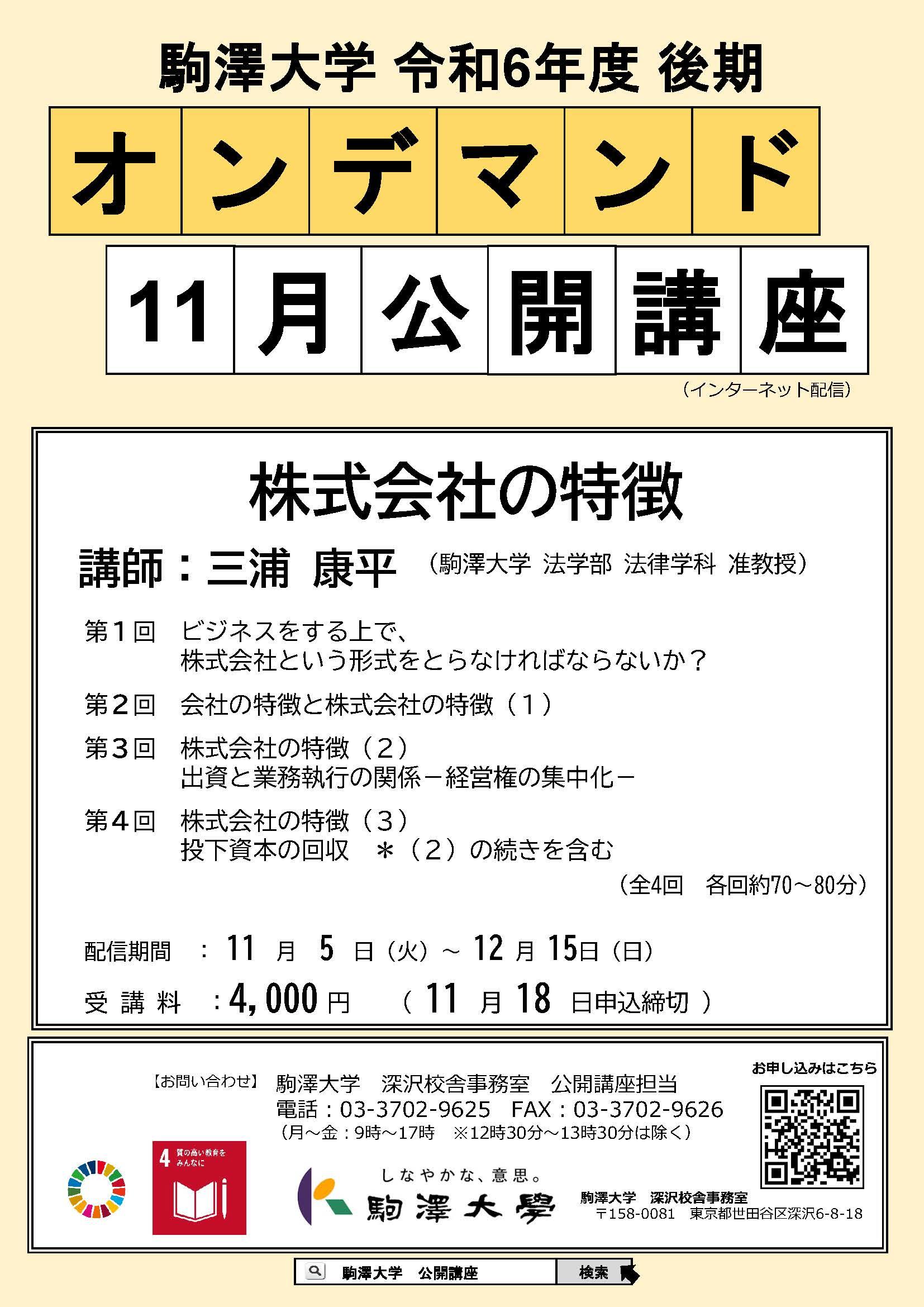 法学部法律学科の三浦康平准教授による「株式会社の特徴」は、11月5日(火)より開講します。