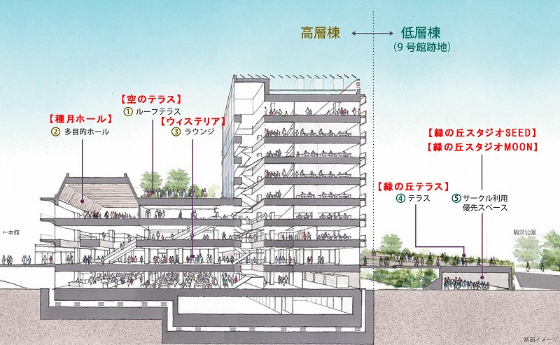 「種月館」と、それに並ぶ「耕雲館」という二つの建物の名前には「絶えざる学び」というメッセージが込められていると思いました。「耕雲種月」という言葉には、宇宙的なスケールの大きさがあり、また高層棟のルーフテラスは屋上緑化されるとのことなので、緑豊かな空中庭園に、駒澤大学で学んだ学生たちが社会に飛び立っていく姿と、明るい太陽のイメージを重ね合わせ、「空のテラス」としました。