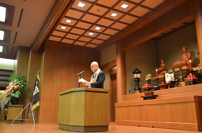 永平寺を開かれた道元禅師は、先ず自ら姿勢を正し、吸う息吐く息を 臍下丹田で腹式呼吸に調え、心を澄ませて生かされているいのちの尊さに気づくこと、人生の一大事とはそういうことだと教えます。本学で坐禅の教えを学んだ皆さんは、いつもこの真実を忘れないようにして、どんな困難に出会っても逃げることなく現実をしっかり受けとめ、世の為に、人の為になる道を力強く歩んで行って欲しいと願います。全ては己れの生き方一つにかかっている道理です。